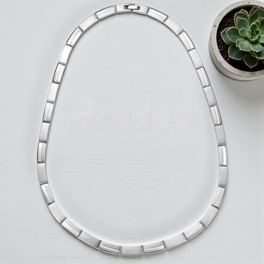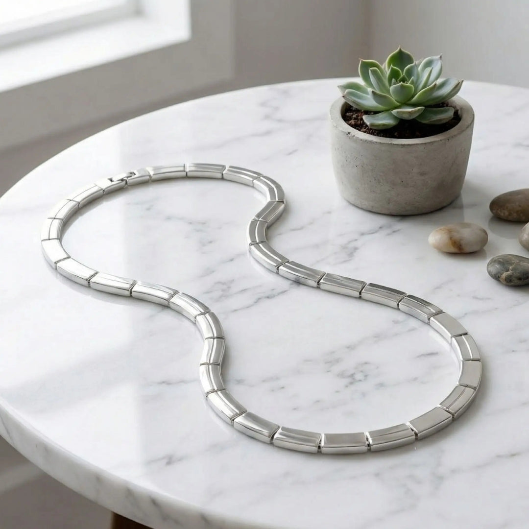 Avec ses maillons rectangulaires parfaitement alignés, ce collier contemporain épouse la base de votre cou dans un mariage parfait entre confort et design architectural.