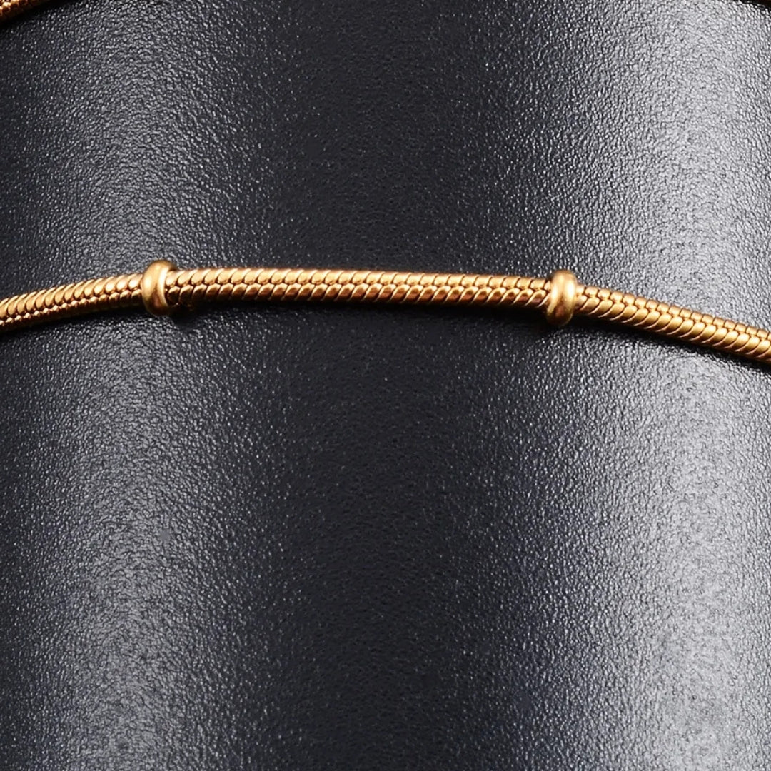Le secret réside souvent dans les détails. Cette chaine fine de style serpent avec ses billes cylindriques délicatement espacées crée un effet visuel captivant.
